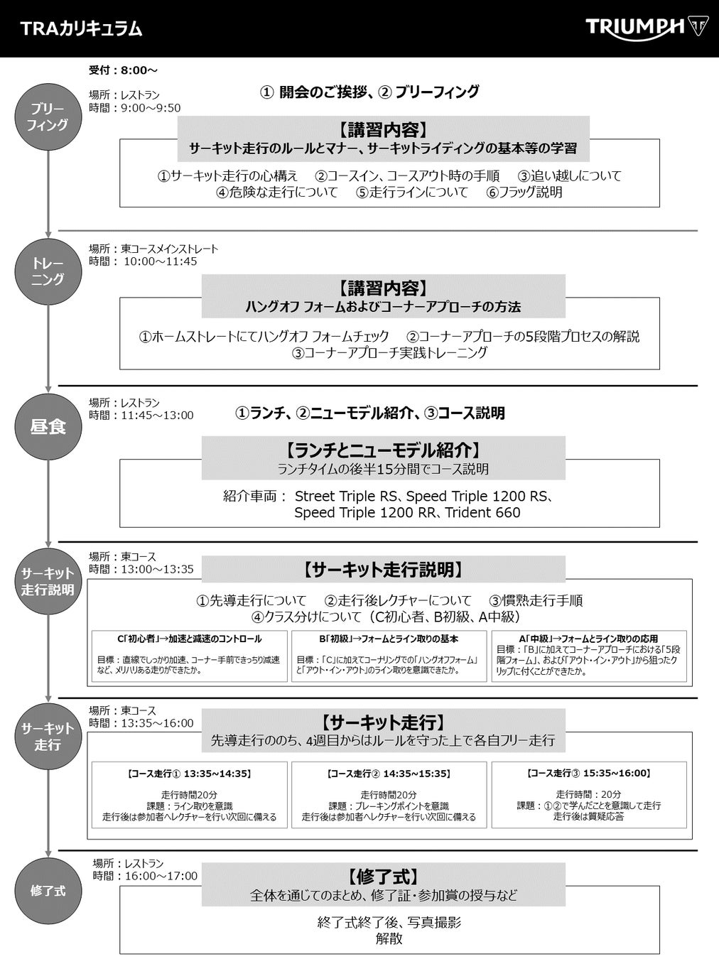 トライアンフがご用意するサーキットでのレッスンを通し、ライディング技術の向上、そして安心して安全に走るためのライディングテクニックを習得していただくことがTRAのコンセプトとなります。