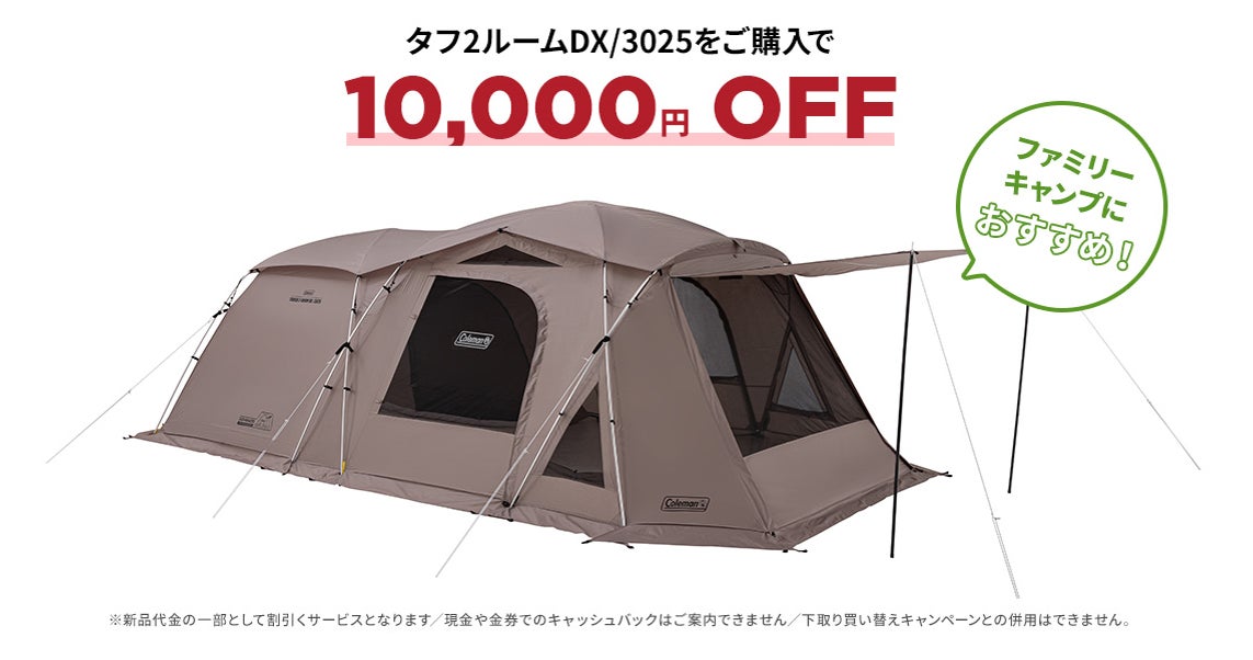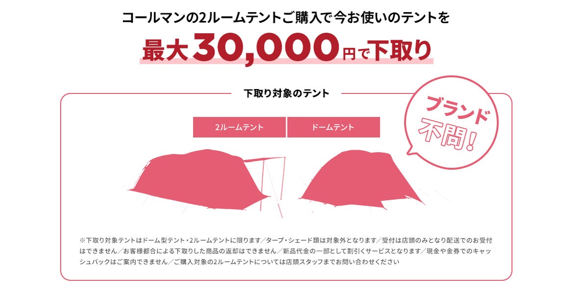 新シーズンに向けたテントの買い替えを応援!コールマンの各種2ルームテントを購入すると、現在お持ちの2ルームテント/ドームテント(ブランド不問)を最大30,000円で下取りし、その分の本体購入金額を割引いたします。