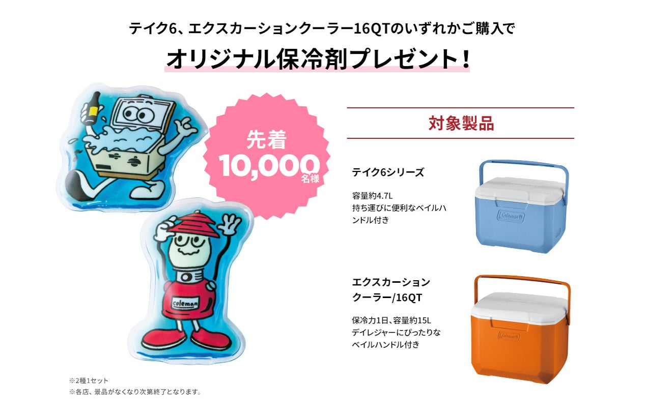 近所の公園などで気軽にアウトドアを楽しむ“ワンマイルピクニック”を応援!荷物も運べるタイヤ付きチェア「ワンマイルチェア」を購入すると、ワンマントルランタンがデザインされた大容量マルチバッグ(総勢先着5,000個)をプレゼント。また、コンパクトで持ち運びやすいハードク―ラー「テイク6」「エクスカーションクーラー/16QT」を購入するとコールマンのキャラクターがデザインされたオリジナル保冷剤をプレゼント(総勢先着10,000セット)いたします。