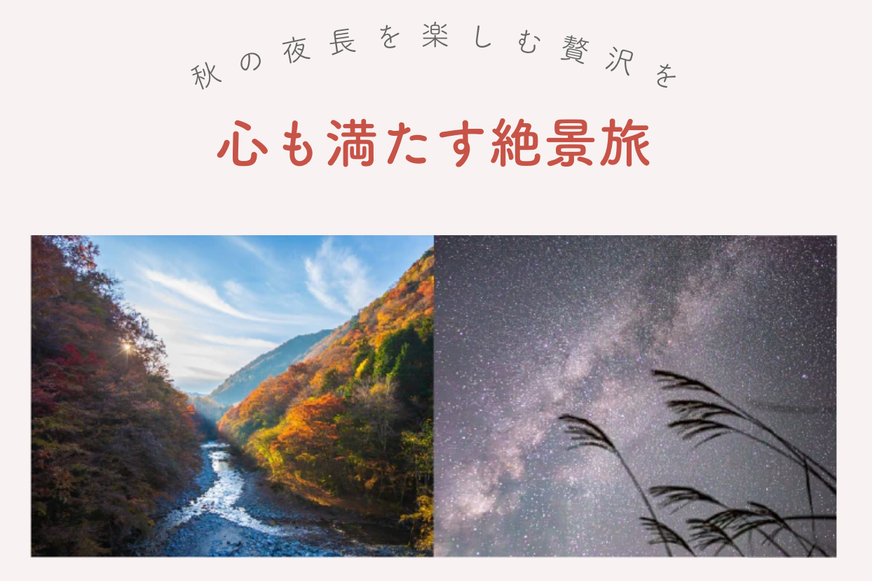 秋の風景と言えば、木々が彩る紅葉(こうよう)を思い浮かべる方も多いのではないでしょうか。昼は山を彩る紅葉を楽しみ、夜は満天の星空を眺め、秋だからこその贅沢を味わいましょう。