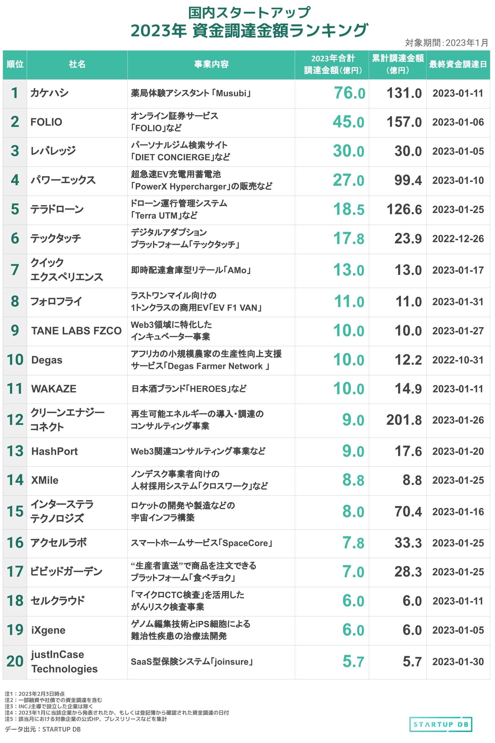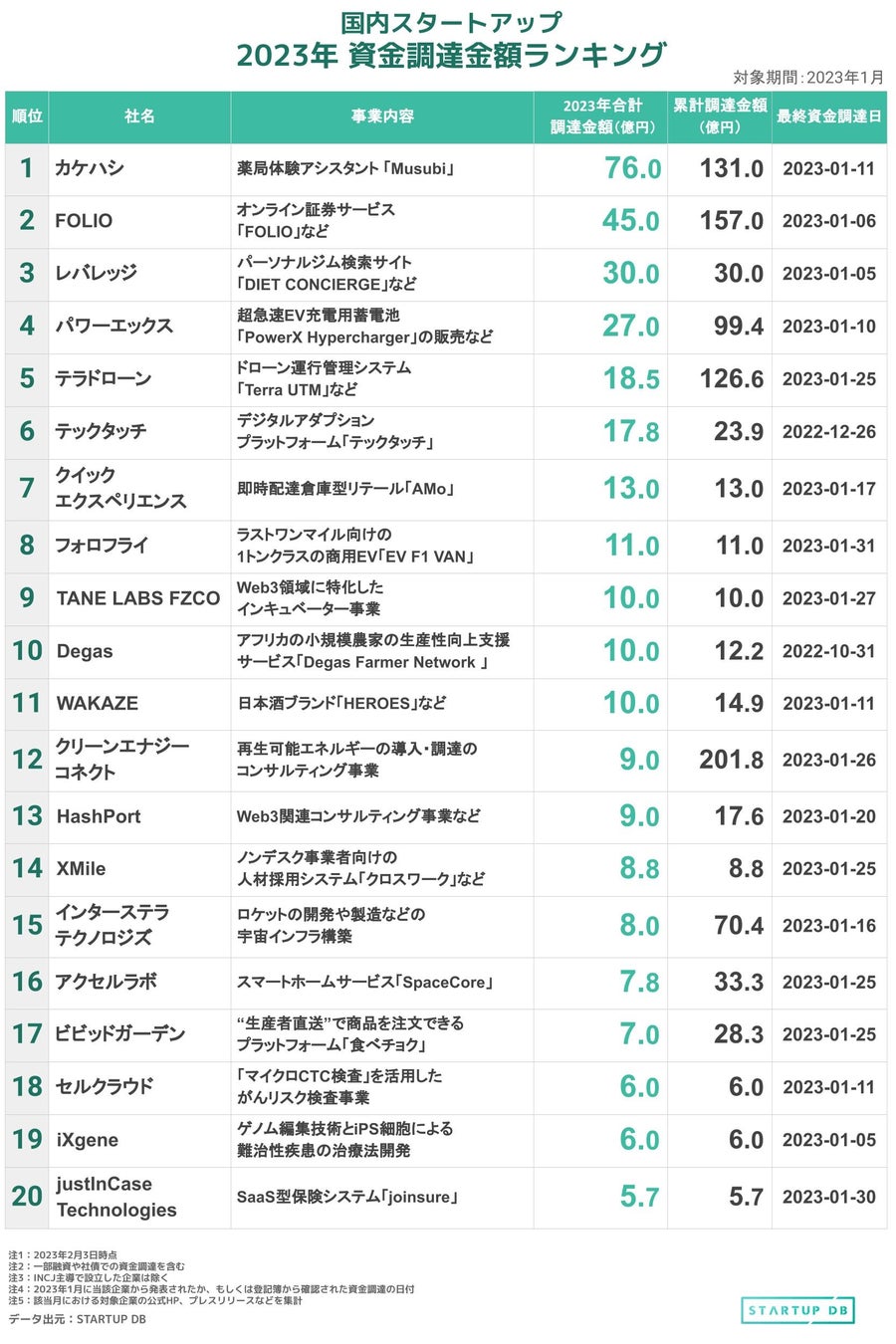 【STARTUP DB】調査結果 国内スタートアップ資金調達金額ランキング(2023年1月)