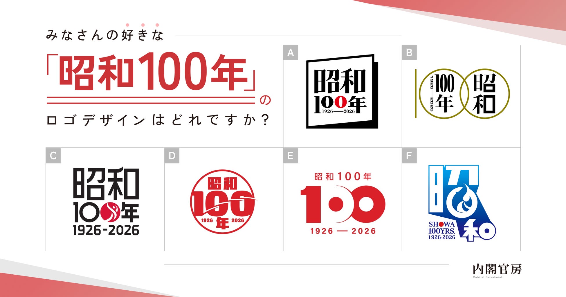 「昭和100年」ポータルサイトや、政府、地方公共団体等が取組を実施する際に使用できる関連施策のロゴデザインを決定するにあたり、その参考とするため、一般投票を行います。