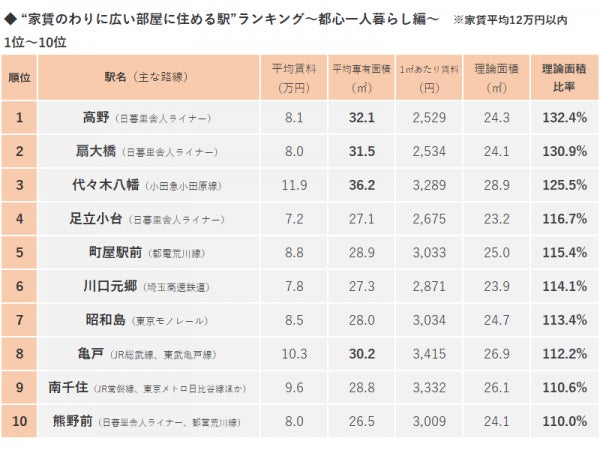 - 「"家賃のわりに広い部屋に住める駅"ランキング~都心一人暮らし編~」では【主要路線の補完的役割を果たしている路線の駅】が上位にランクイン