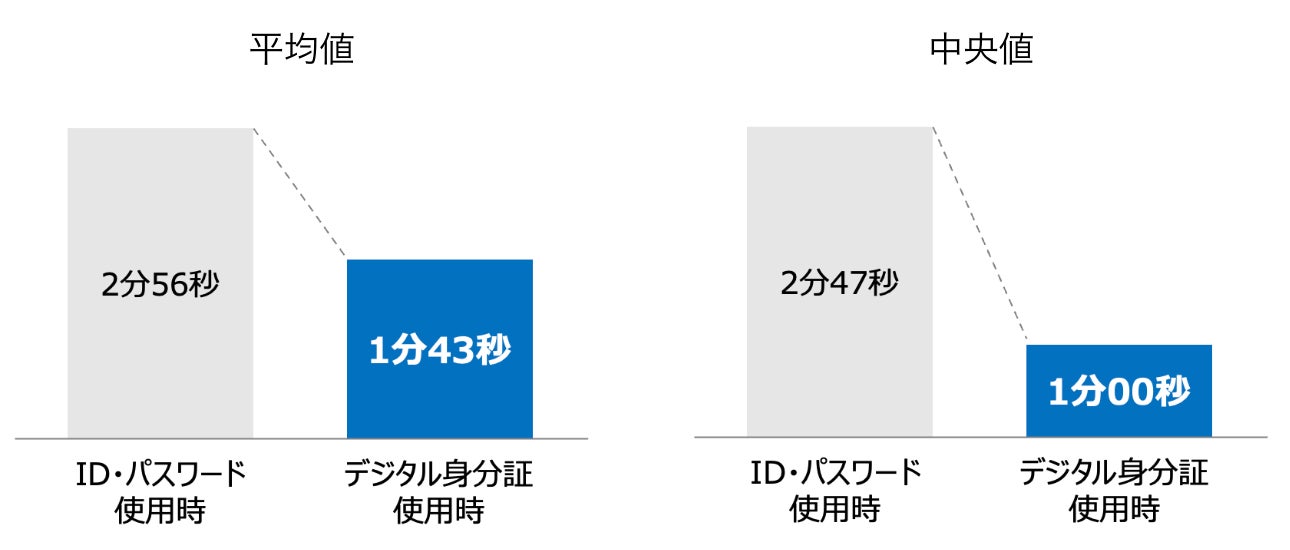 更に、検証3については、アプリの操作ログをもとに実際のユーザーの操作(ユーザーの新規登録機能)で要した時間を分析した結果、ID・パスワード使用時に比べ、デジタル身分証を利用した場合、大幅に時間短縮ができたことが確認できました。