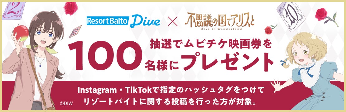 全国約4,600施設以上の観光施設に特化した人材サービス事業を行う株式会社ダイブ(東京都新宿区 代表取締役社長:庄子潔、証券コード151A、以下ダイブ)は、2025年8月29日公開の劇場アニメ『不思議の国でアリスと』とのスペシャルコラボとして、リゾートバイトの思い出を募集するSNS企画を実施いたします。