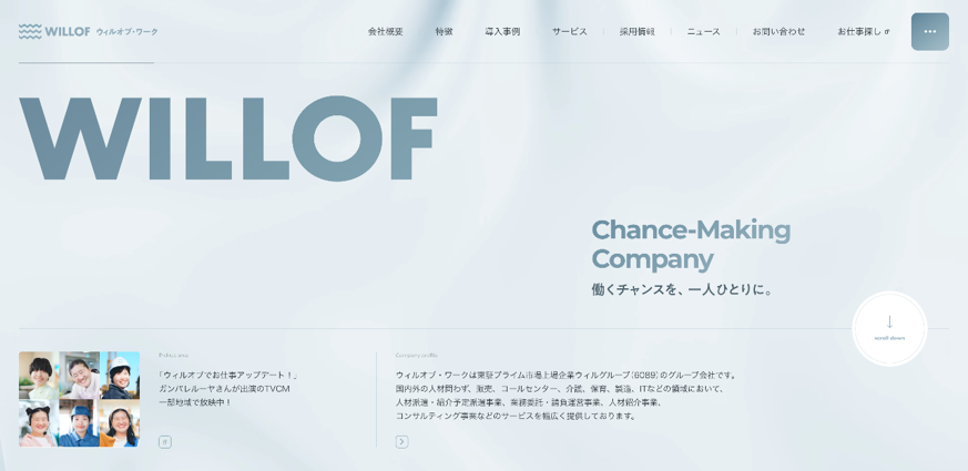 ウィルオブ・ワークは、販売やコールセンター、介護をはじめ、業種に特化した 「人材派遣」「業務請負」「人材紹介・紹介予定派遣」サービスを提供しており、業種に特化した教育活動を通して、専門性の高い人材ビジネスを展開しています。当社が掲げる『Chance-Making Company』のビジョンのもと、すべての人の可能性を信じ、あらゆる人の働く機会、そして多様な働き方も増やしていきたいと考えています。