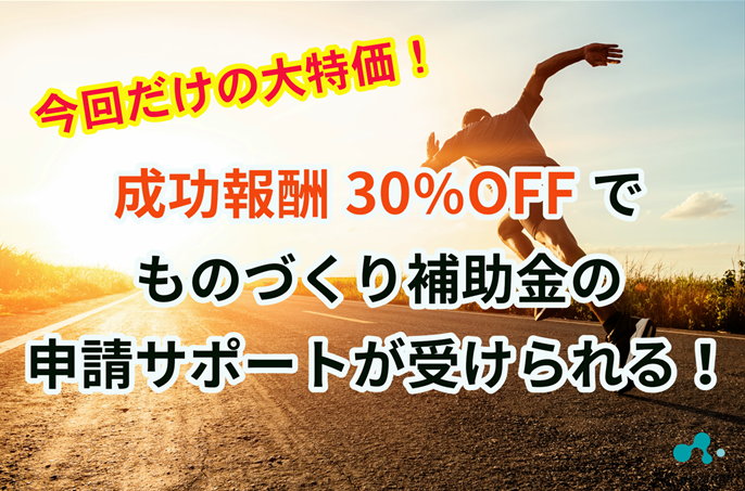 補助金の申請サポートを行うリアリゼイションは、「ものづくり補助金」(第17回締切分)において、今回の公募に限り「成功報酬金額30%OFFキャンペーン」を実施いたします。