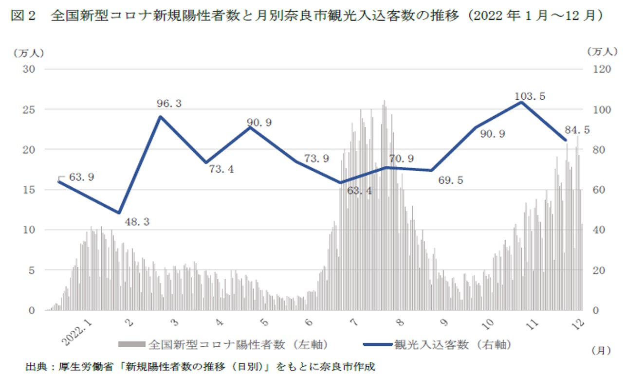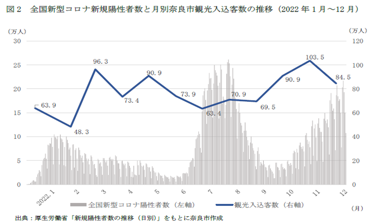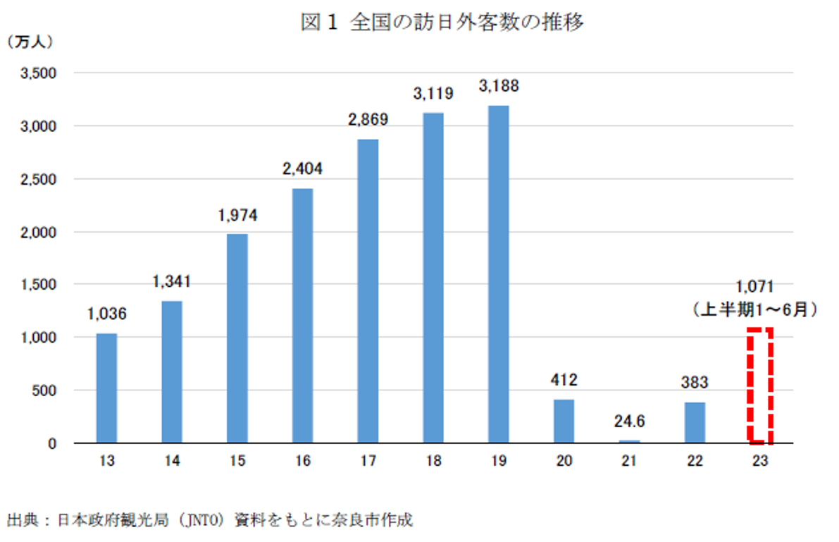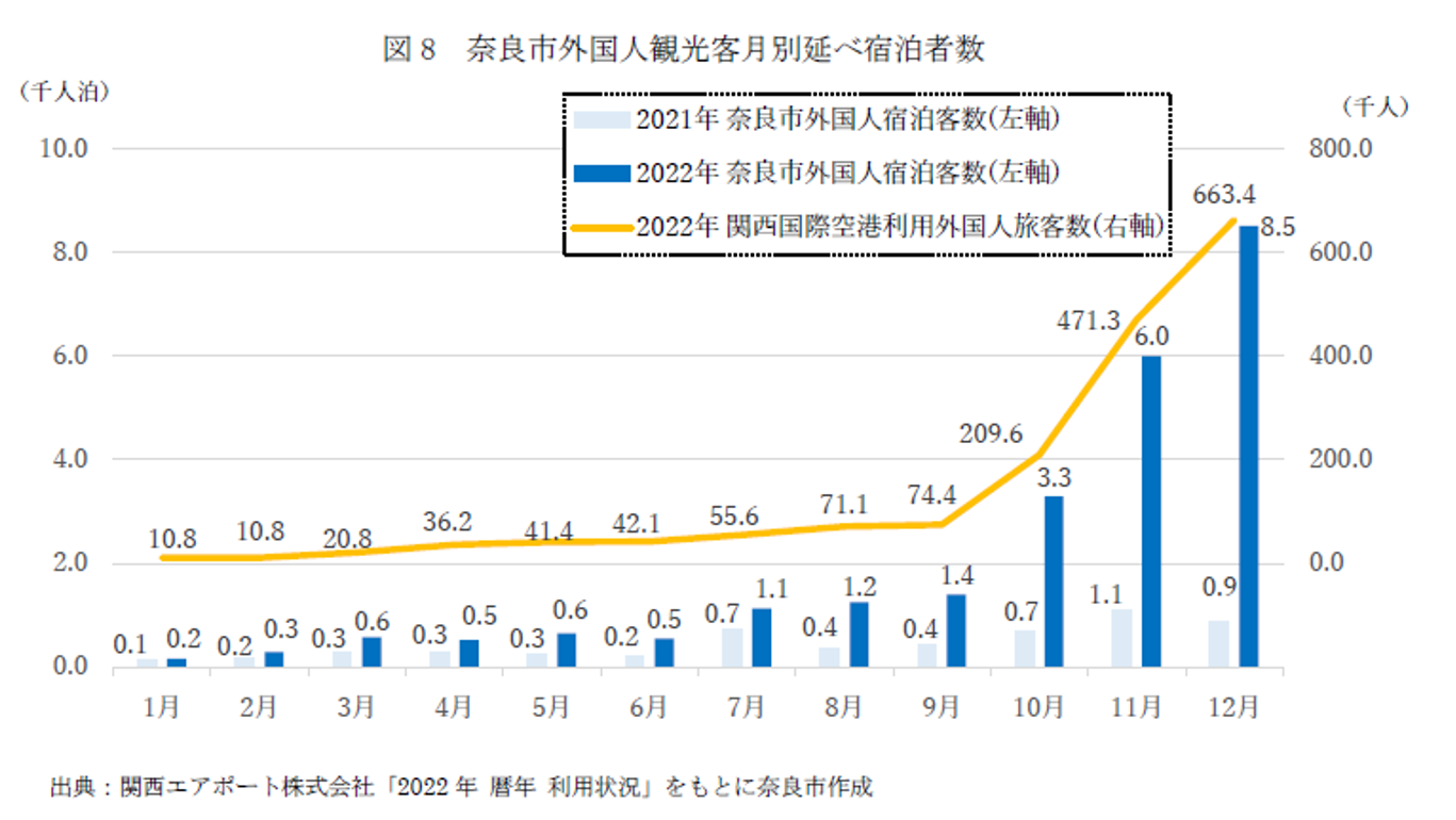 ◆2022年に奈良市を訪れた観光客数は929.4万人(前年比 26.5%増)。うち、一般観光客数が852.4万人(前年比 21.0%増)。10月から政府による観光需要を目的とした「全国旅行支援(全国旅行割)」がはじまり、国内旅行へ出かける意識が高まった。