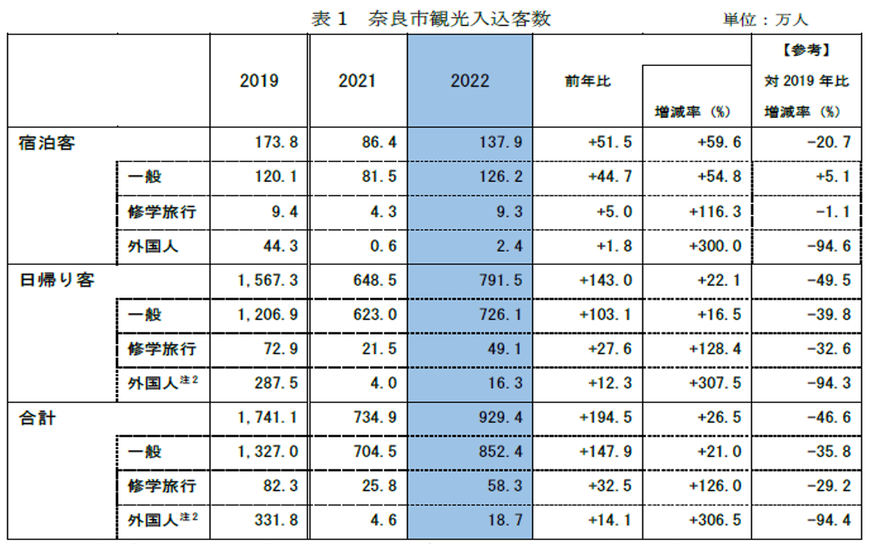 2022年に奈良市を訪れた観光客数は、929.4万人(前年比26.5%増)でした。
