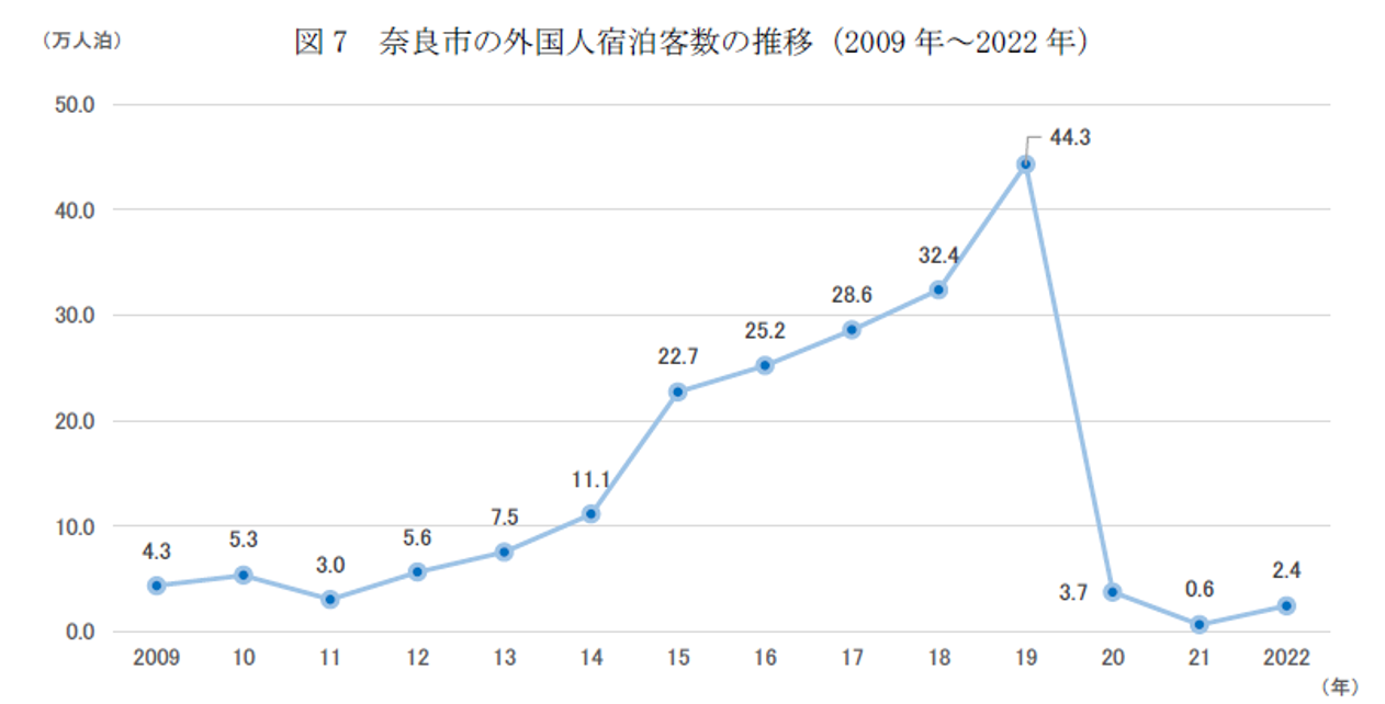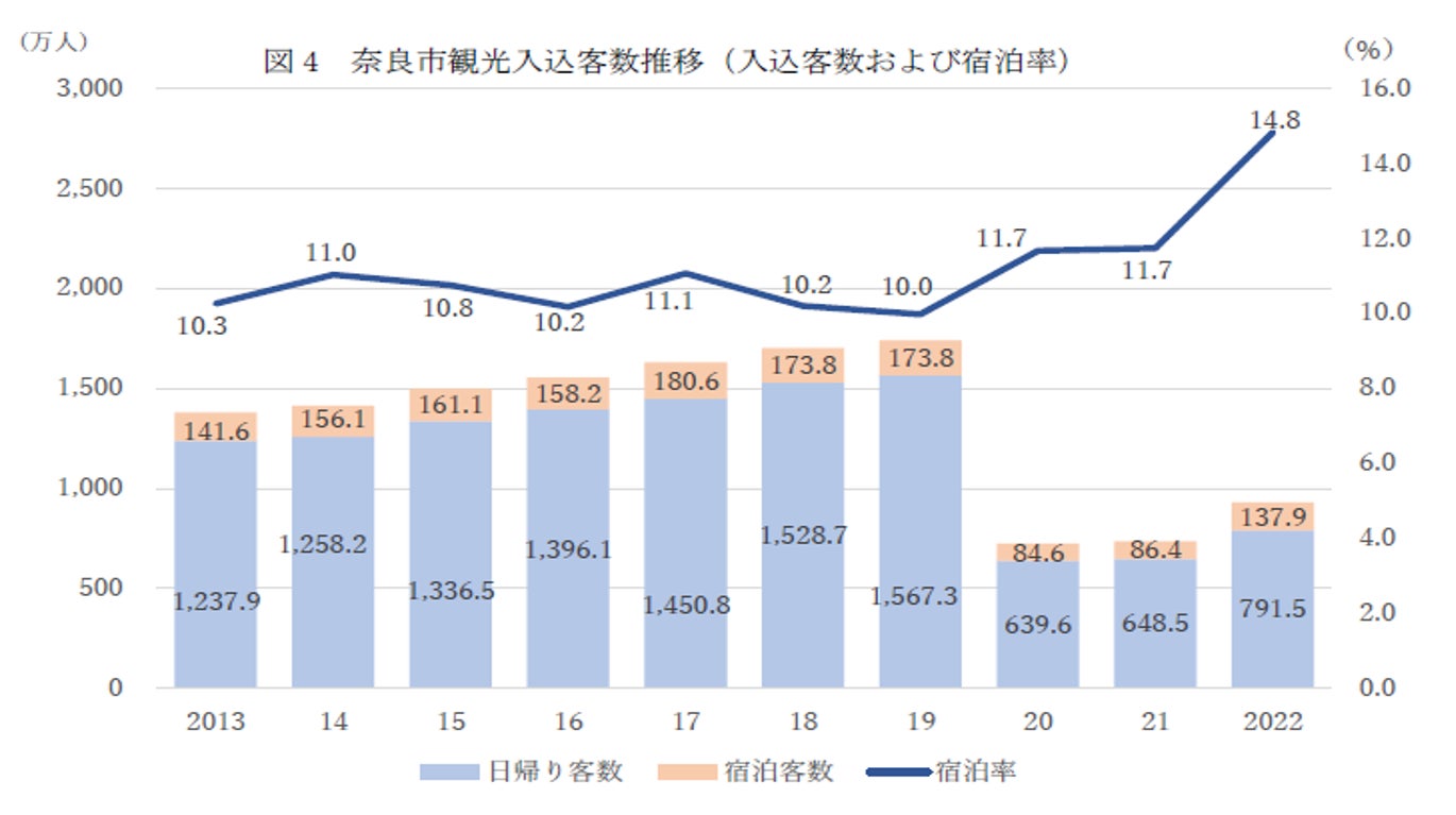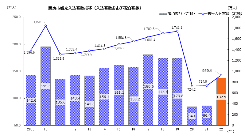 2022年の奈良市の宿泊客数は137.9万人(前年比59.6%増)でした。