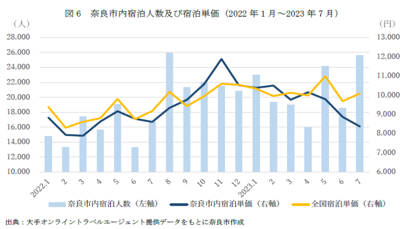 【参考値】大手オンライントラベルエージェント経由で、2022年1月~2023年7月の期間に利用があった奈良市内の宿泊単価と全国の宿泊単価を比較しました。2022年6月及び9月から11月までは全国の宿泊単価を上回ったものの、2023年5月以降は下回る月が続いています。