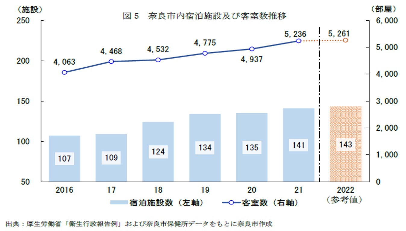 【参考値】奈良市内宿泊施設数は2021年から2施設増加の143施設となりました。また、客室数についても、昨年度から25部屋増加し、推計で5,261部屋となりました。