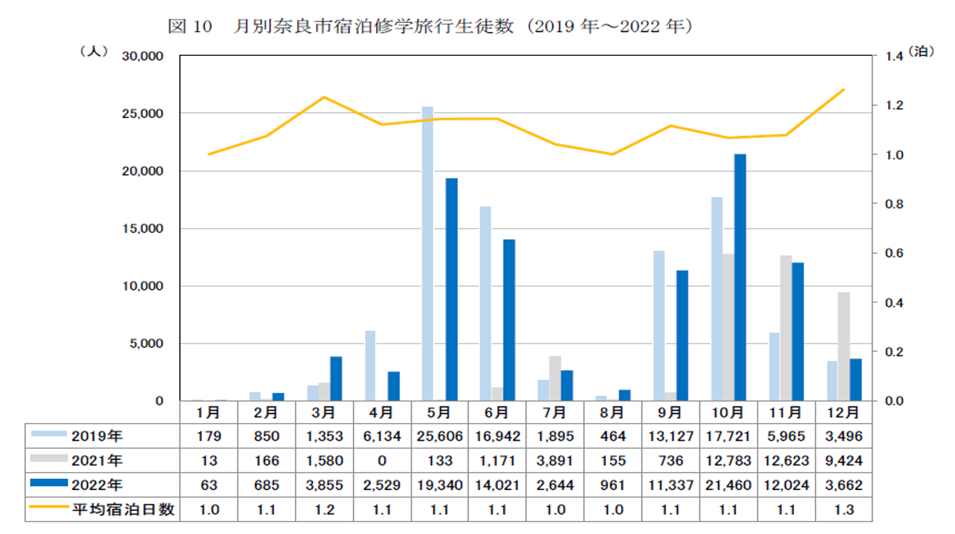 2022年に奈良市を訪れた修学旅行生徒数は、58.3万人(前年比126.0%増)と、2021年と比べ大幅に回復しました。月別の宿泊修学旅行生徒数を各年で比較しますと、「奈良県いまなら。キャンペーン2022プラス(全国旅行支援)」が修学旅行も支援対象となったこともあり、10月以降はコロナ禍前の2019年を上回る結果となりました。