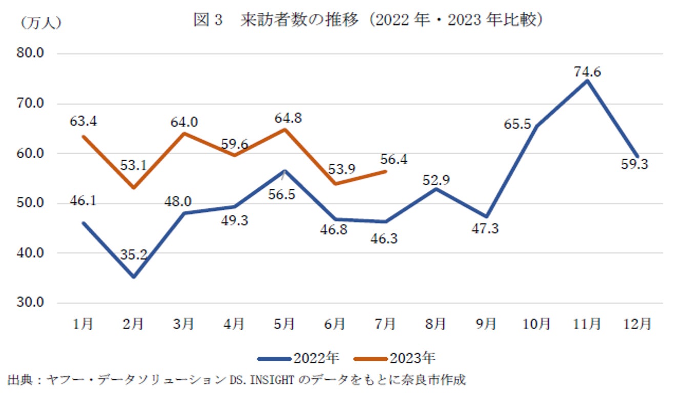 【参考値】ビッグデータを用いて、東大寺・奈良公園・奈良町などの市内主要観光エリアを来訪した人(来訪者)を集計した結果、2023年1月~7月の全ての月で、2022年を上回る結果となり、好調に推移しています。なお、本データには訪日外国人観光客は含まれていません。