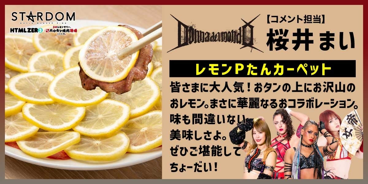 0秒レモンサワー®×スターダムのコラボ飲み放題は、「HTML ZERO3」のデザインによる「スターダム」の選手があしらわれたシロップでお楽しみいただけ、オリジナルデザインのマドラーをプレゼントいたします。また、「スターダム」の選手が選んだおすすめお肉メニューをご注文いただくと、「HTML ZERO3」デザインのオリジナル箸置きをプレゼントします。期間中は、店内に選手等身大パネルを設置しフォトスポットが登場。店内BGMも選手入場曲となりキャンペーンを盛り上げていきます。