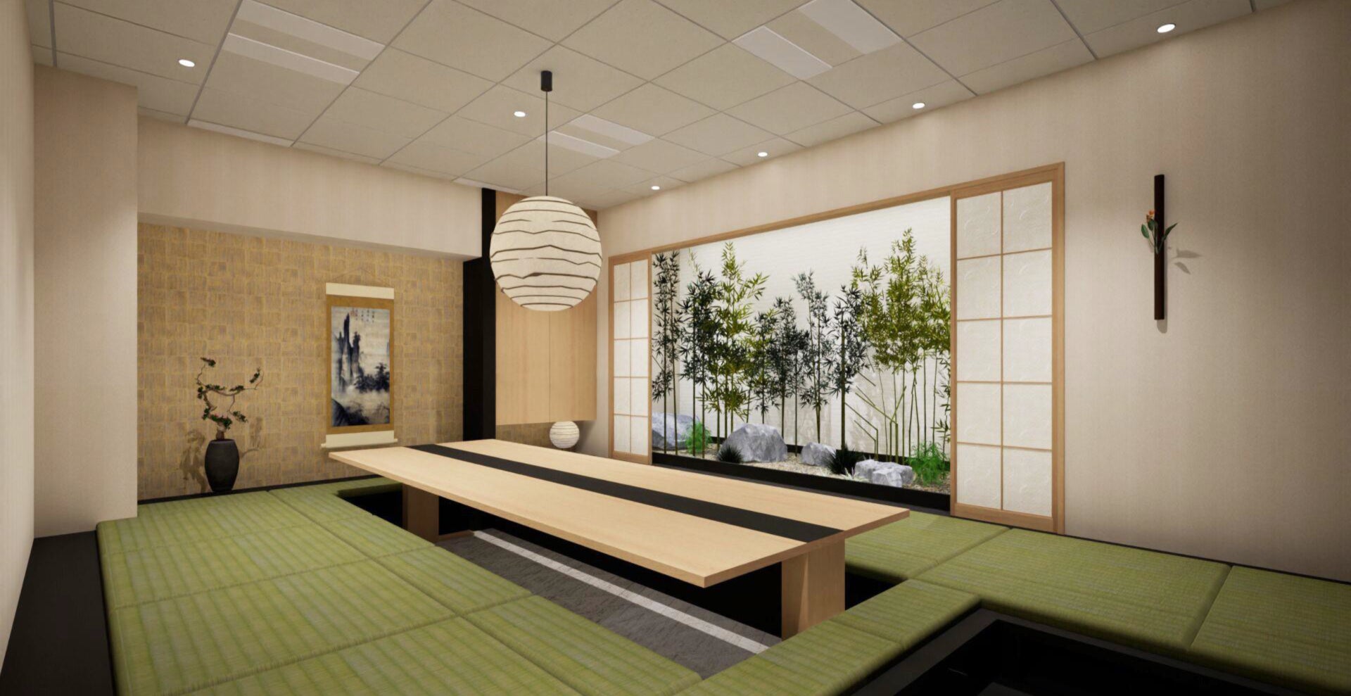 デザインやレイアウトにもこだわり、中でもお客様やお取引先様をご案内するための応接室は7部屋設けました。インバウンドの影響を受け、外国人顧客にも喜んでいただけるような和室の応接室や、より洗練されたラグジュアリーな空間を意識した応接室など、応接室ごとに異なるコンセプトで設計いたしました。また大阪本社と同様に、社員同士のコミュニケーションの場となるリフレッシュルームも構えています。リフレッシュルーム内には、休憩時や昼食時にリラックスできるような一人掛けのビーズソファ(Yogibo)や、体力をつけて健康を維持できるように、社員が自由に使えるトレーニングマシンを設置しています。