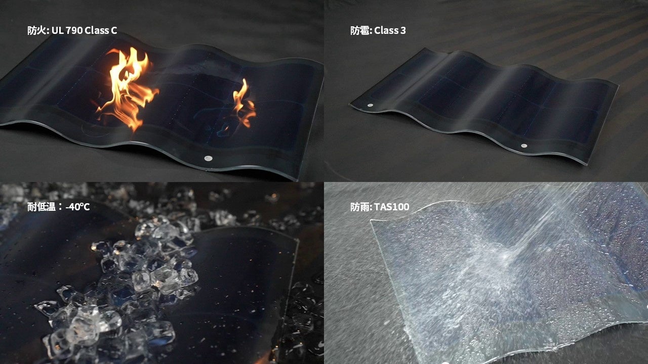 耐久性については、5mmの高強度強化ガラスとアルミ合金部品を使用し、UL790 CLASS Cの耐火性、3 CLASSの雹耐性、TAS100規格の雨水保護機能を備えています。マイナス40℃から85℃まで対応し、幅広い気候に適応可能で、最長25年の保証付きです。