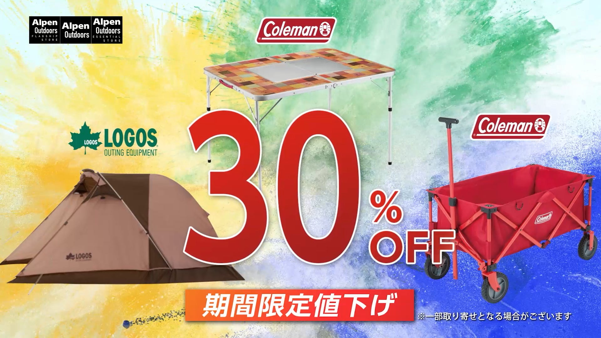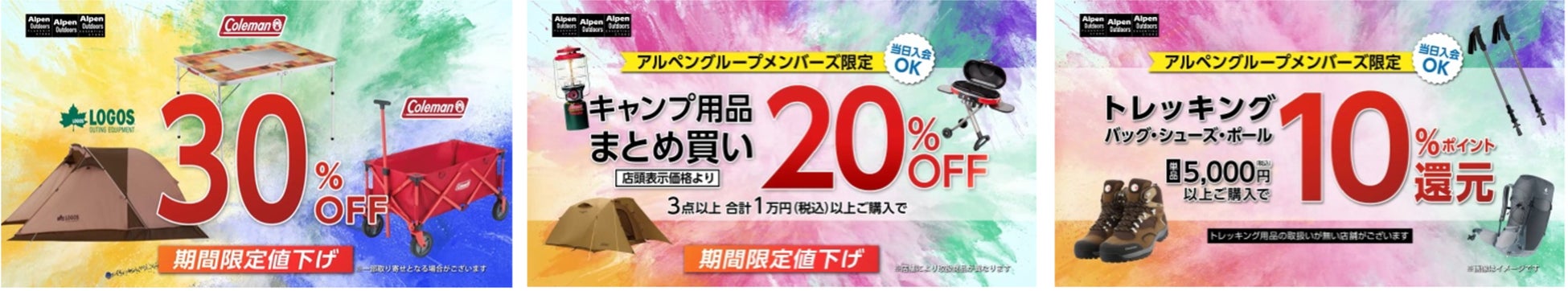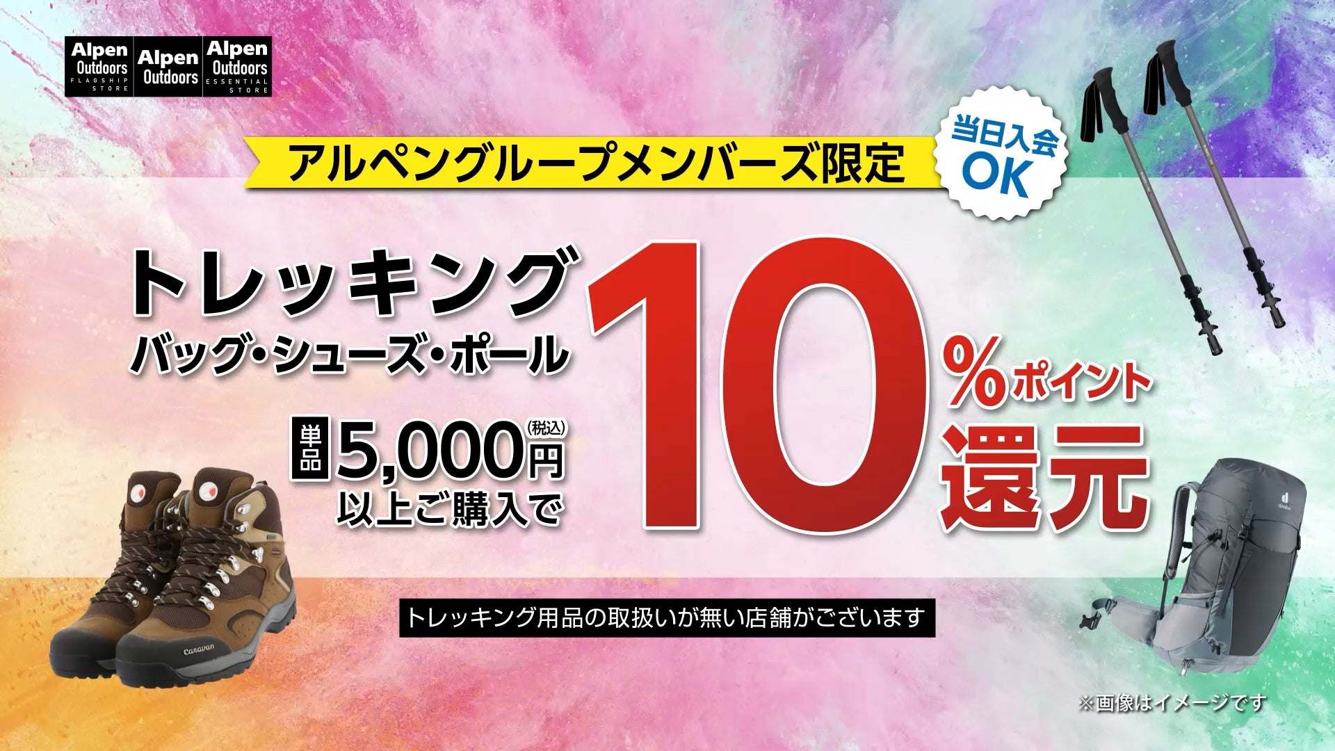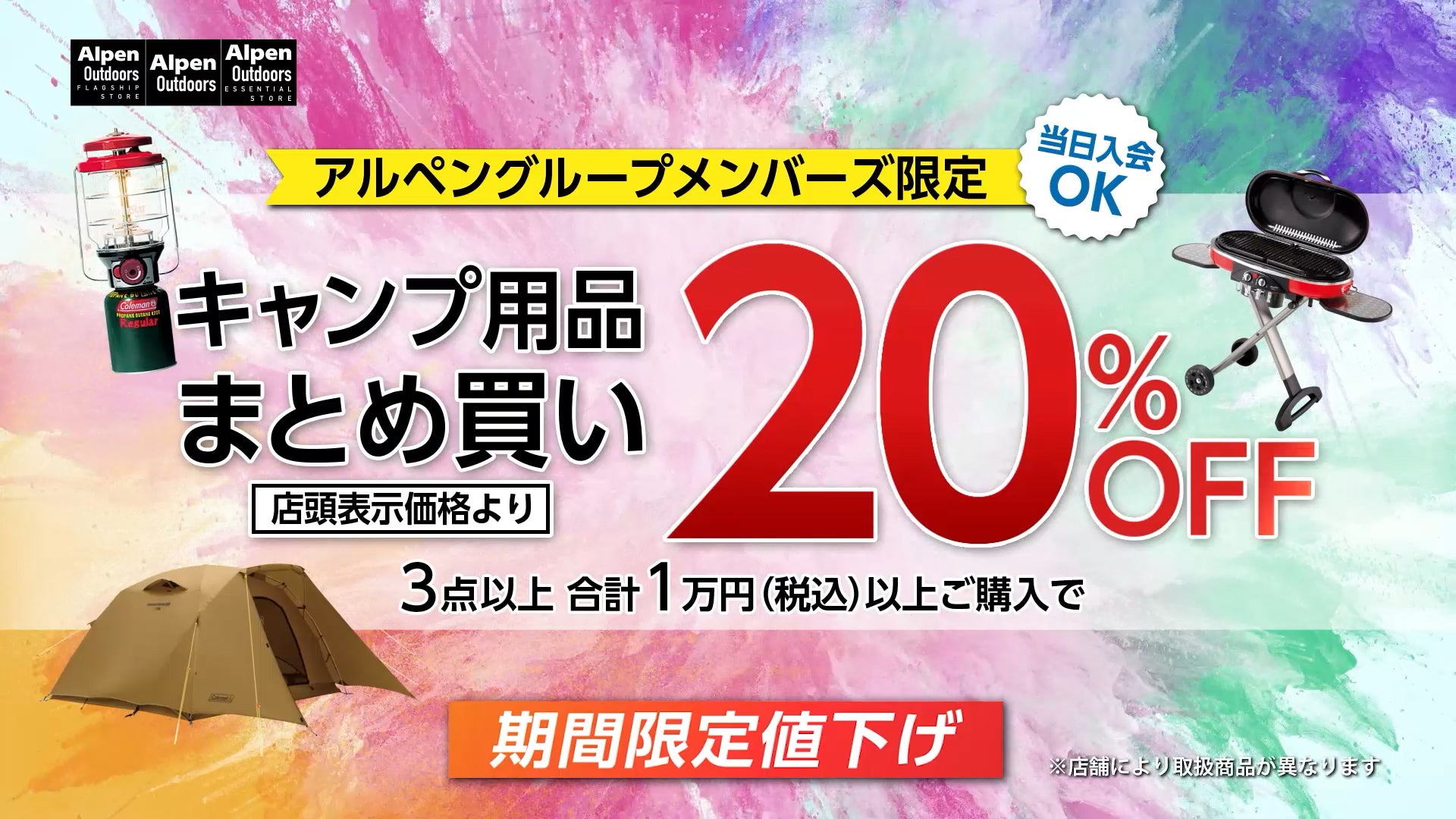 また、価格だけでは無くお得な特典もご用意いたしました。キャンプ用品では、3点以上1万円(税込)以上購入で、お買上合計金額より20%OFF。トレッキング用品では、シューズ・バッグ・ポールを5千円以上(税込)購入で、アルペンポイント10%還元いたします。