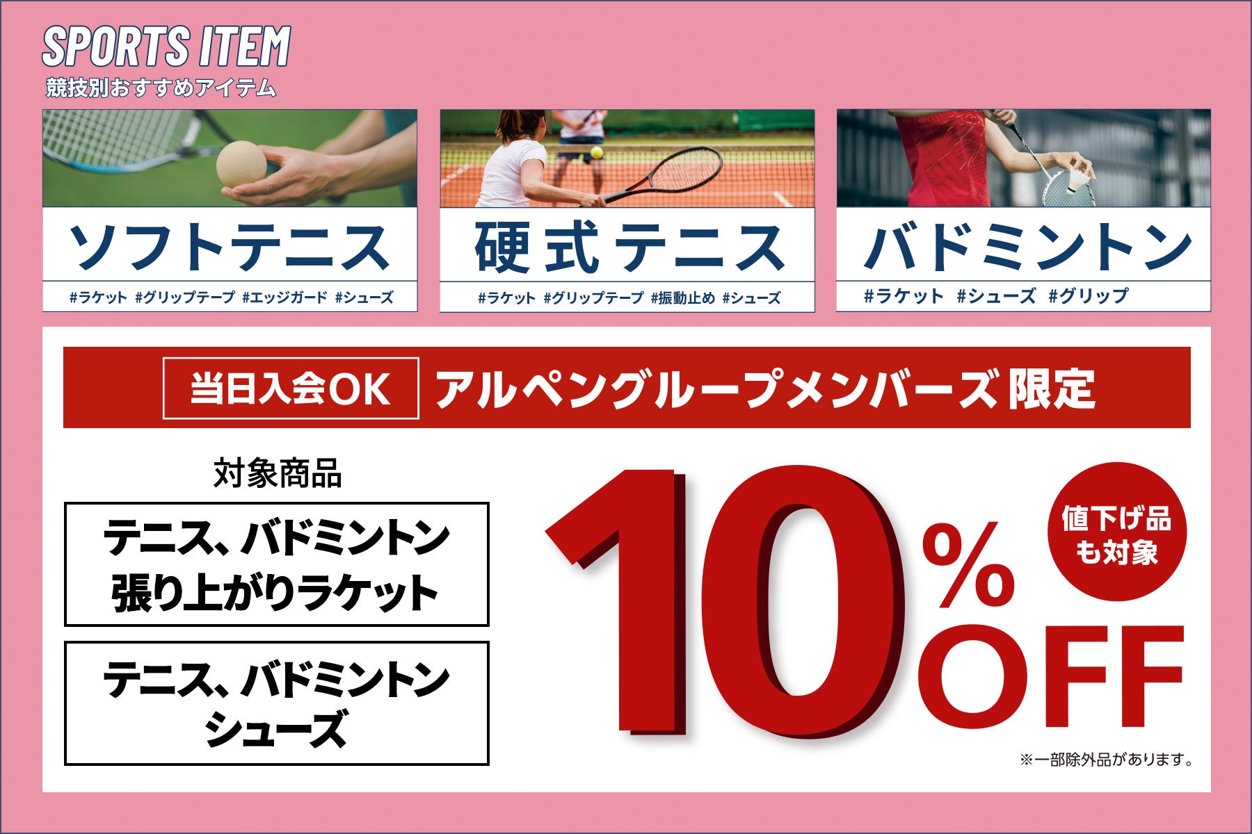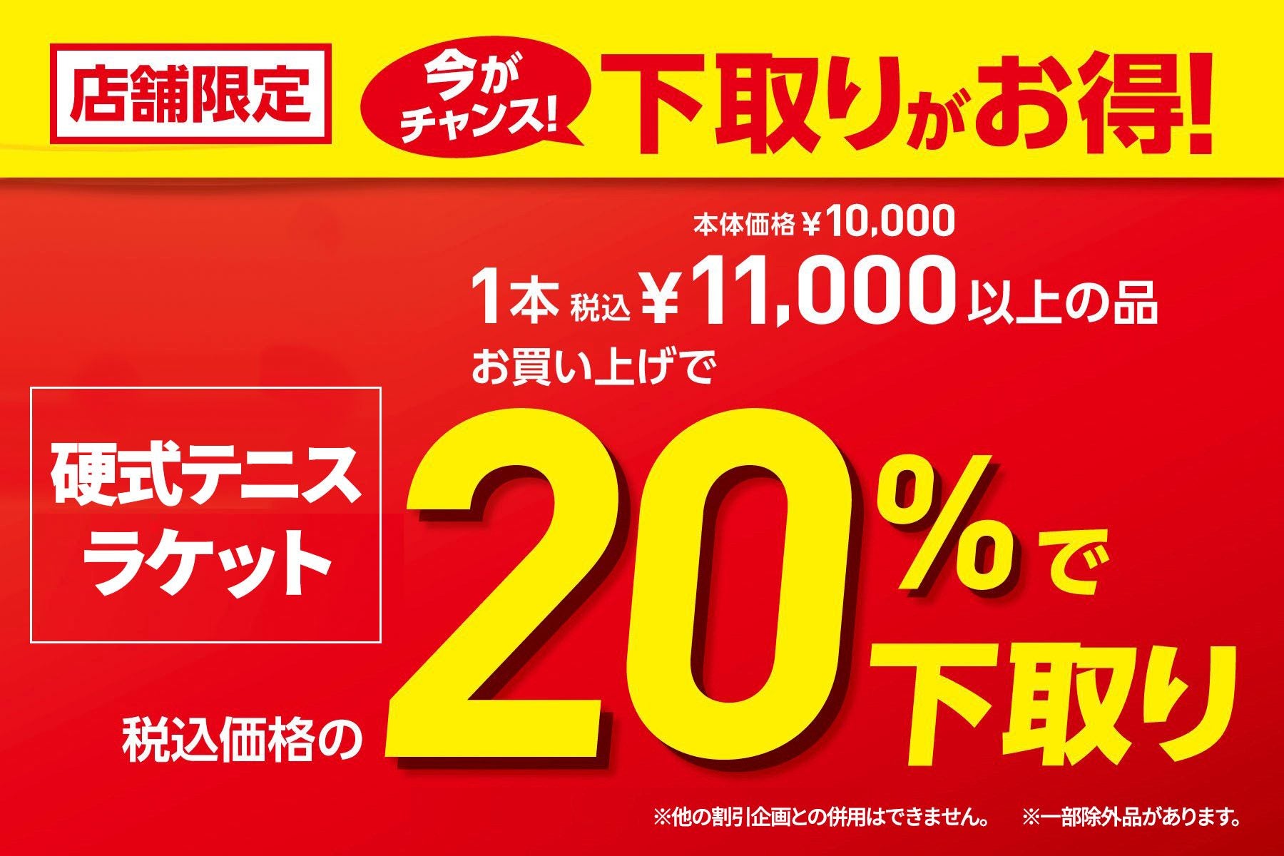 そして、テニス・バドミントン張り上げりラケットは10%OFF。さらに11,000円(税込)以上の硬式テニスラケット購入お方、不要なラケットを購入価格の20%で下取りも実施いたします。買い替えを検討されている方はこの機会をお見逃しないようお買いお求めください。