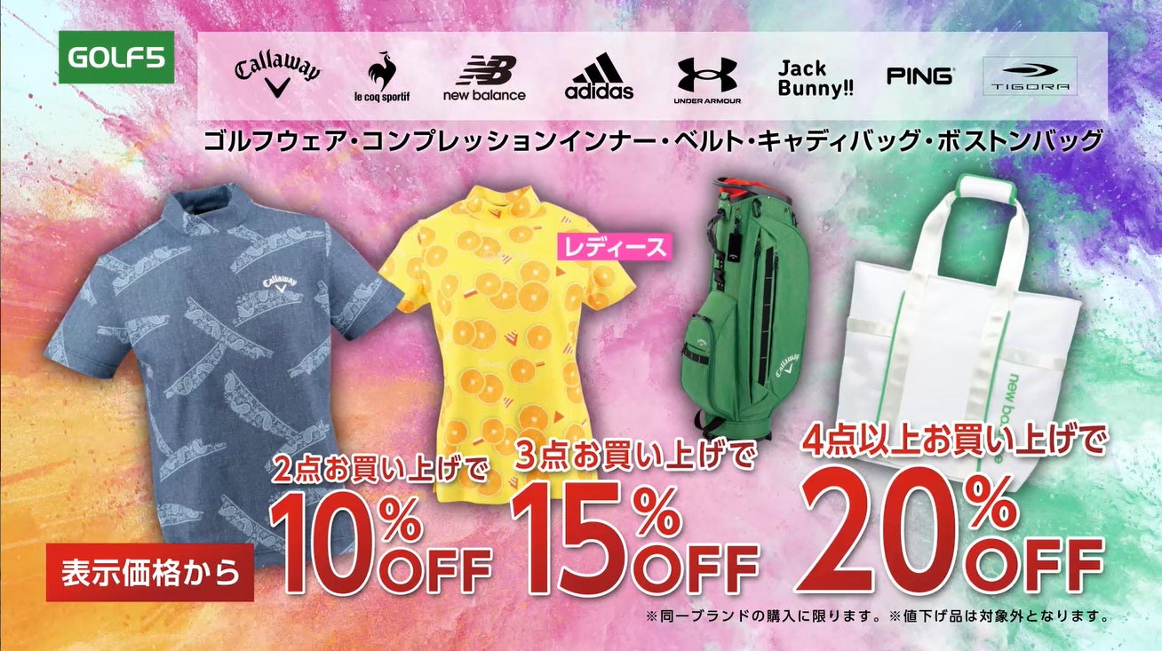 対象ブランドのゴルフウェア・コンプレッションインナー・ベルト・キャディバッグ・ボストンバッグは2点お買い上げで10%OFF、3点お買い上げで15%OFF、4点以上お買い上げで20%OFFになるまとめ買い企画も実施いたします。ゴルフをこれからはじめる方にもぴったりなお買い得企画です。