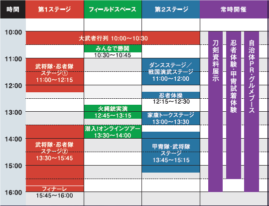 東海地域の甲冑隊が一堂に集結するとともに、岐阜県、京都府の武将隊も駆け付けて雄姿を披露。ステージ上での各隊の演武やパフォーマンスも見どころです。