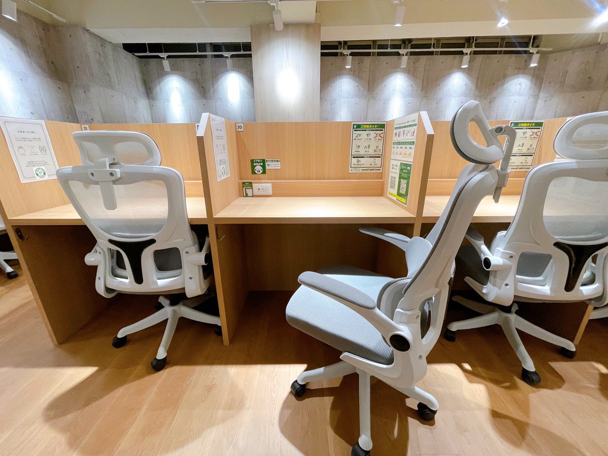 座席はデスク幅が広く、電源コンセントだけでなくUSB Type-CやType-Aで充電可能。全席オフィスチェア導入のため、快適にご利用いただけます。