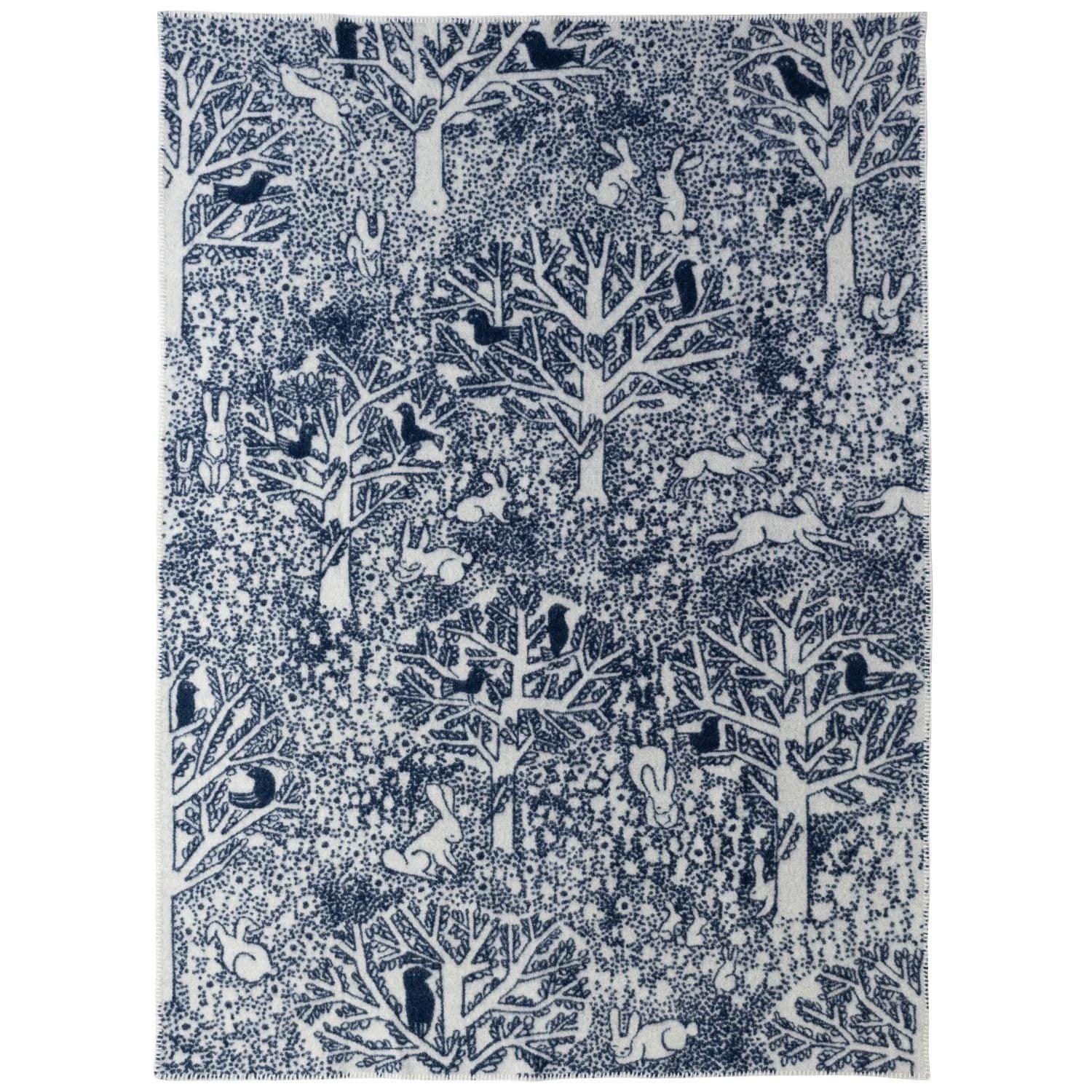 森の中でうさぎが飛び跳ね、鳥が羽を休める様子が描かれたデザイン