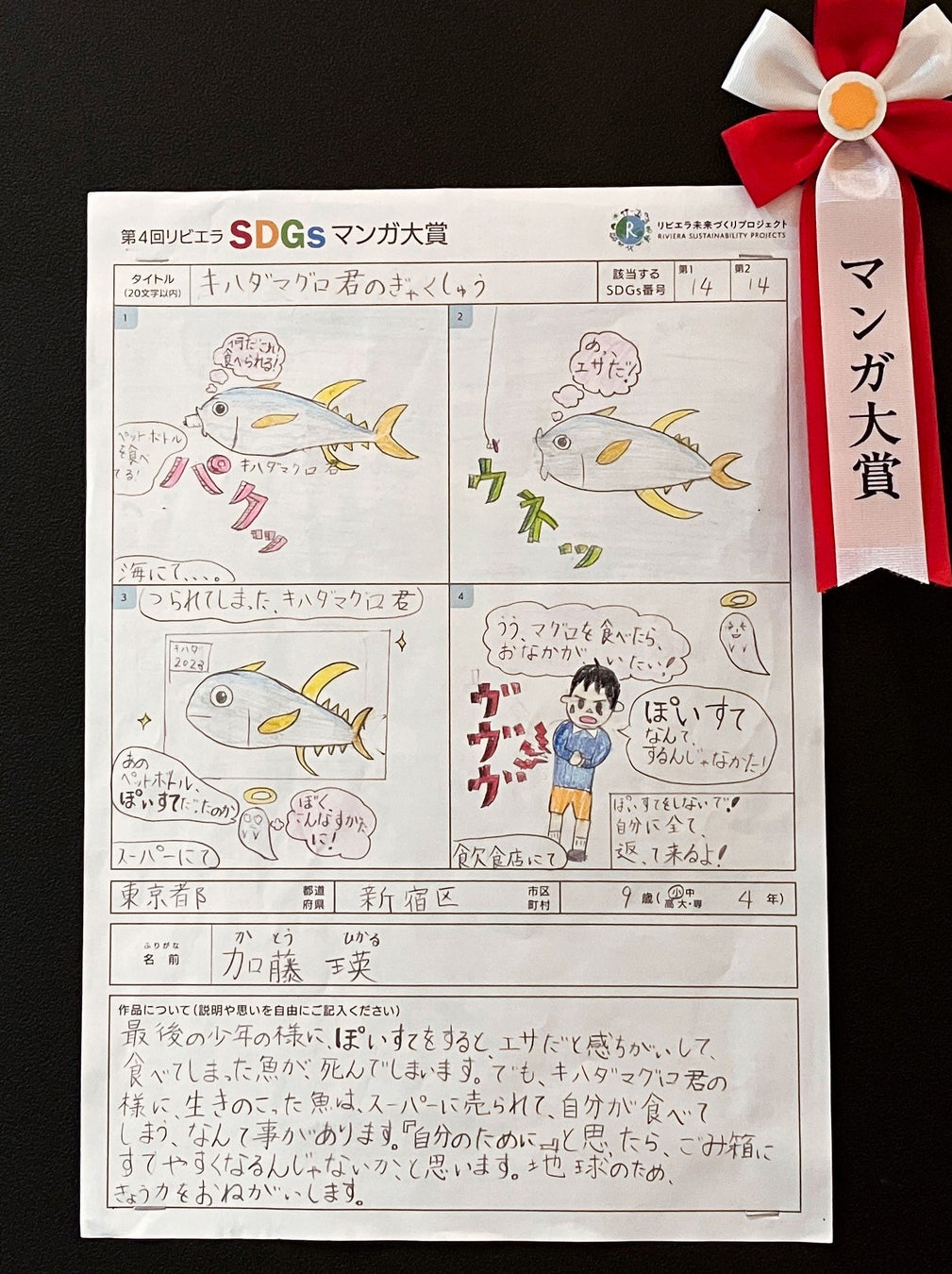 2020年に設立の「リビエラSDGs作品マンガ大賞」は、これまで全国40都道府県の4歳~87歳の3,000人が参加し、サステナブルムーブメントを広げ発信しているアワード。4回目を迎える今回は、環境配慮とDXを踏まえて紙チラシを極力配布せず、印刷・輸送・ゴミ廃棄の段階でのCO₂削減を目指し新たな募集方法にも挑戦。「私たちの未来と地球のために」をテーマに幅広い年齢層から約1,000点の応募作品が寄せられました。全応募作品を展示している展覧会では、多様性あふれる唯一無二の1,000通りのSDGsを目にしていただけます。展覧会は、サステナブルなまちづくりを目指しエココンシャスな場所として認知の広がる【リビエラ逗子マリーナ(神奈川県逗子市)】で、「みんなで考えるSDGsの日」の3⽉17⽇まで開催中。