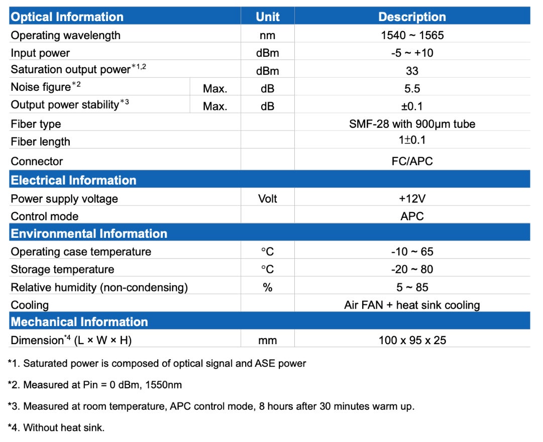 同製品は、Cバンド領域(1540~1565 nm)に対応し、シングルチャネル用途向けに設計された光増幅モ ジュールです。最大33 dBm の飽和出力を実現しつつ、最大5.5 dBの低ノイズフィギュアを維持することで、高品質な信号増幅を可能にします。