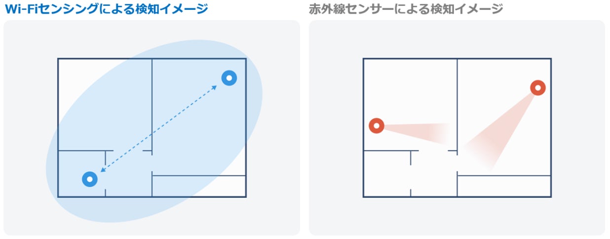 人や物の移動により変化が生じた電波の反射到達経路パターンを機械学習により判定し、動きを検知した場合にアラートとして専用アプリに通知します。従来の赤外線センサーと比較し、広範囲(約100㎡以上)の検知が可能です。