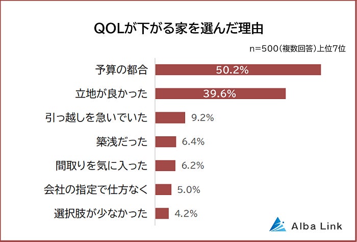 なぜQOLが下がる家を選んだのかという問いには、「予算の都合(50.2%)」と回答した人が最も多く、全体の5割を超えました。2位「立地が良かった(39.6%)」も4割近くと多くなっています。