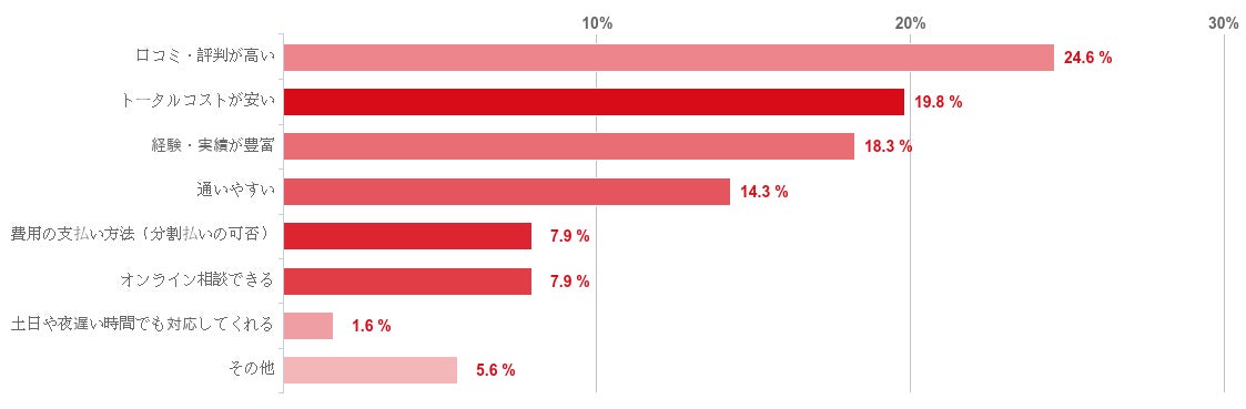 「口コミ・評判が高い」が24.6%で最も多く、「トータルコストが安い」も19.8%で次に多かった。また、「経験・実績が豊富」が18.3%でこれに続いた。