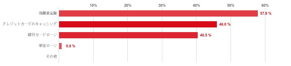 「クレジットカードのキャッシング」が57.9%で最も多く、「消費者金融」が46%でこれに続いた。また、「銀行カードローン」との回答も40.5%あった。