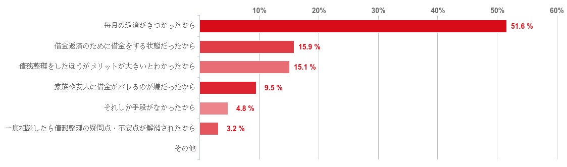 「毎月の返済がきつかったから」が51.6%で圧倒的に多かった。なお、その他には「借金返済のために借金をする状態だったから」(15.9%)、「債務整理をしたほうがメリットが大きいとわかったから」(15.1%)などの回答が集まった。