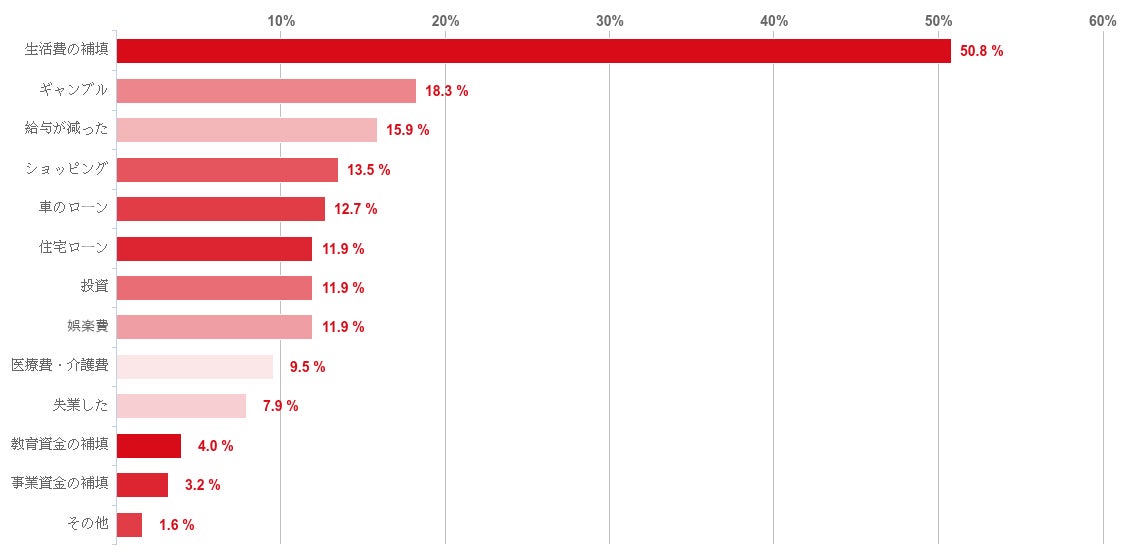「生活費の補填」が50.8%で圧倒的に多かった。なお、次に多かったのは「ギャンブル」(18.3%)で、「給与が減った」が15.9%でこれに続いた。