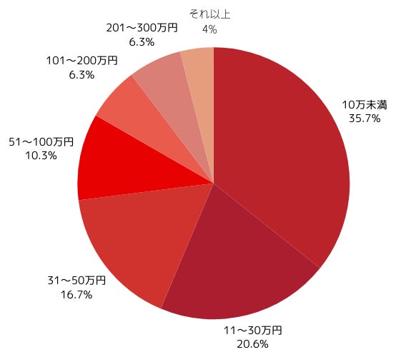 「10万円未満」が35.7%で最も多かった。また、「11〜30万円」(20.6%)がこれに続き、回答はほぼ金額順となったが、「それ以上(300万円以上)」との回答も4%あった。