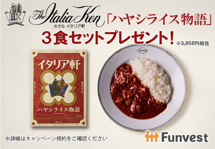 【A賞】300万円以上の出資でもれなく【B賞】抽選で10名様に「ホテルイタリア軒ハヤシライス物語」3食セット(3,050円相当)」をプレゼント!