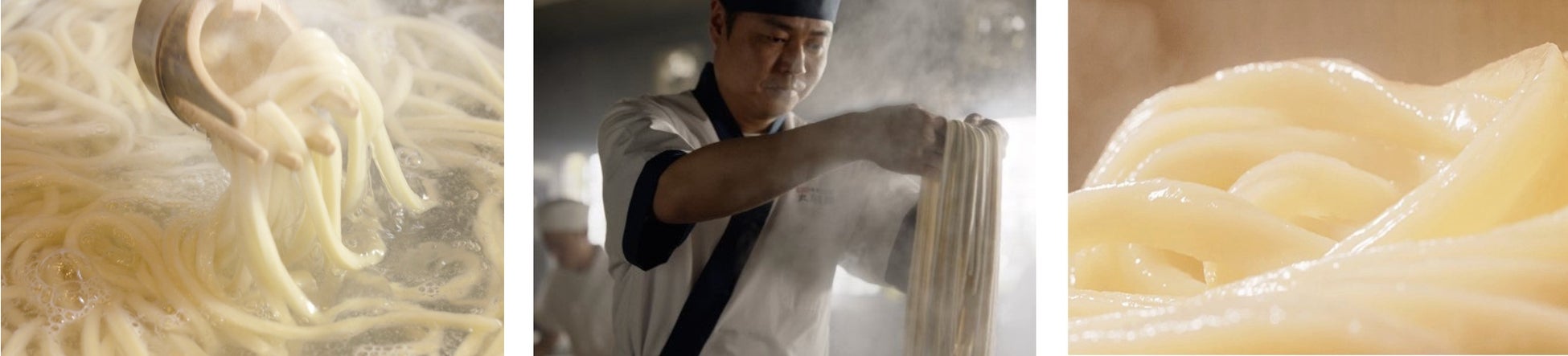 技と感性を磨いた「麺職人たち」が、100%国産の小麦粉を毎日打ち、その場で麺を切って、茹でて、つくりたてをお客さまに提供しているからこそ、独自のもちもちの食感とおいしさを守り続けることができているのです。