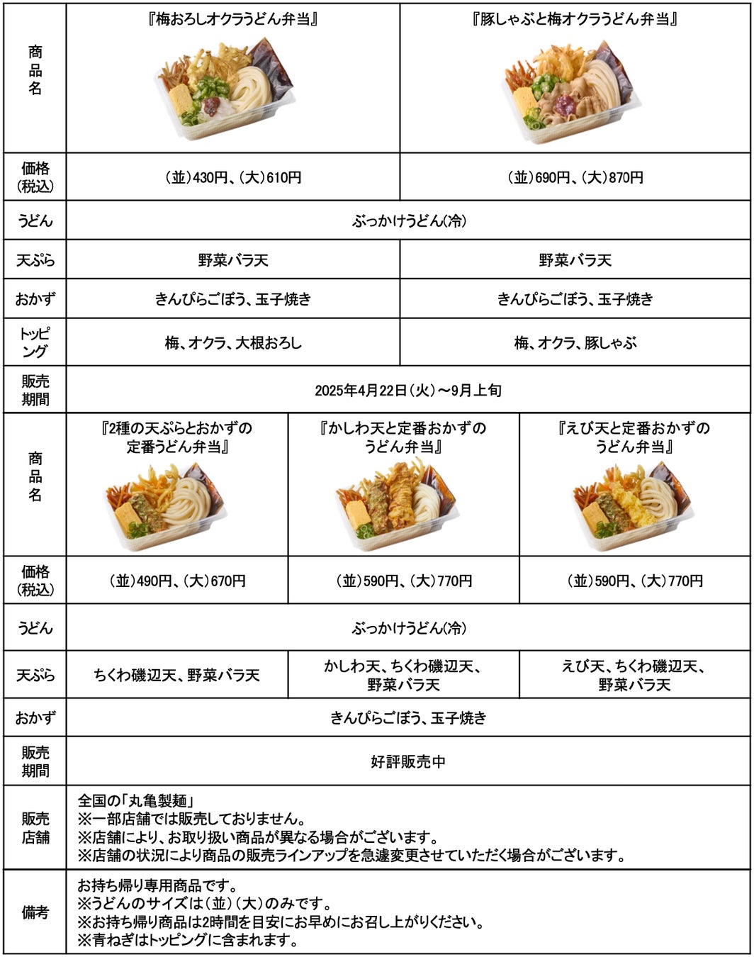 また、お客さまの声にお応えして「丸亀うどん弁当」に初のサイズ展開となる“大”サイズが登場。うどん1.5玉が入り、満足感のある一杯をお楽しみいただけます。この春は、手に取りやすい430円の商品も加わり、味わいは全5種のラインアップをご用意しています。爽やかな春風が心地よく、外での食事がより楽しくなる季節。ゴールデンウィークのおでかけやピクニックはもちろん、さまざまなシーンでお気軽にお楽しみください。
