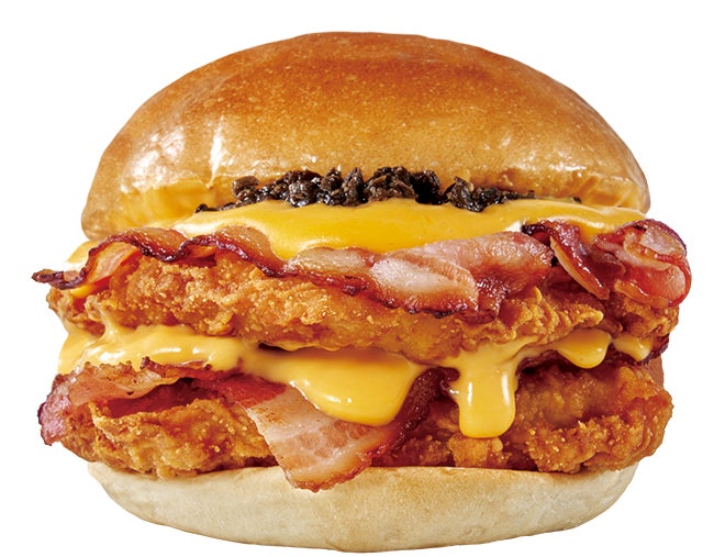 ウェンディーズの高級バーガー第4弾は、アメリカ本国の定番メニューで日本でも大人気の「ベーコネーターUSA」をベースに開発されたジャパンオリジナルです。刻んだ黒トリュフのソースと香り豊かな白トリュフオイルを使用し、コクのあるとろ~りチーズと組み合わせました。柔らかいフィレ肉とサクサクの衣が特徴のウェンディーズオリジナル「ホームスタイルチキン」との相性は抜群です。