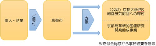 再生医療をはじめとしたライフサイエンス分野の研究開発を支援するため、御支援いただいた寄付金から、事務経費を控除した額を ① iPS財団への寄付、 ② 京都発革新的医療技術研究開発助成事業の助成金として活用させていただきます。
