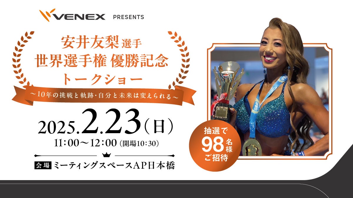 リカバリーに関するサービスや商品を開発する株式会社ベネクス(所在地:神奈川県厚木市、代表取締役:中村 太一、以下、当社)は、ベネクスアンバサダーでもある安井友梨選手が2024年12月にビキニフィットネス世界一に輝いたことを記念し、2025年2月23日(日・祝)11:00日本橋にてトークショーを開催することが決定しました。