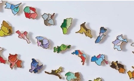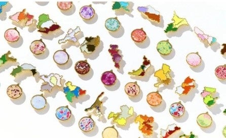 47都道府県それぞれの形を、北海道は「ラベンダー」、神奈川県は「あじさい」、熊本県は「阿蘇山」のように、名産品や名所などをイメージした色で彩り豊かに表現したピンバッジです。
