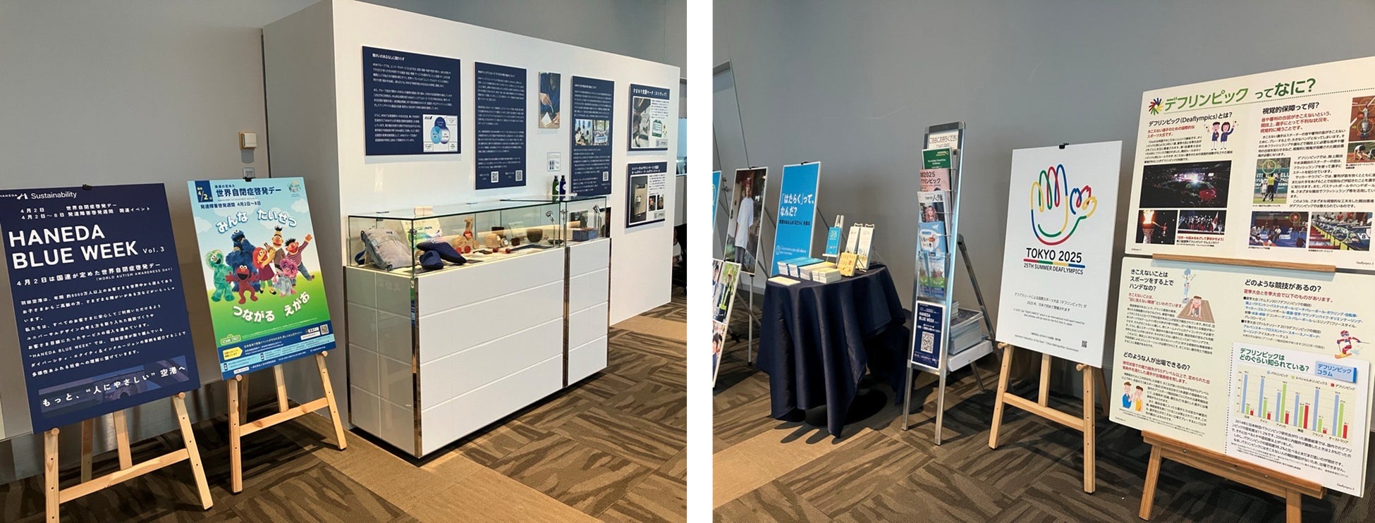羽田空港のバリアフリーサービスや、障がい者とプロデザイナーの共創から生まれた手荷物カートの展示、「ANAそらぱす教室(搭乗支援教室)」の紹介パネル、ANAグループの障がいのある社員が企画・製作に携わった商品の展示、そして東京2025デフリンピックについての知識を深める展示ブースなど、さまざまな取り組みを紹介いたします。