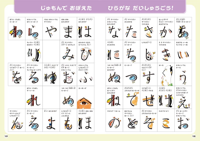 1万人以上の子どもたちが笑いながらひらがなを覚えた“じゅもん”を見開き1ページで見ることができます。