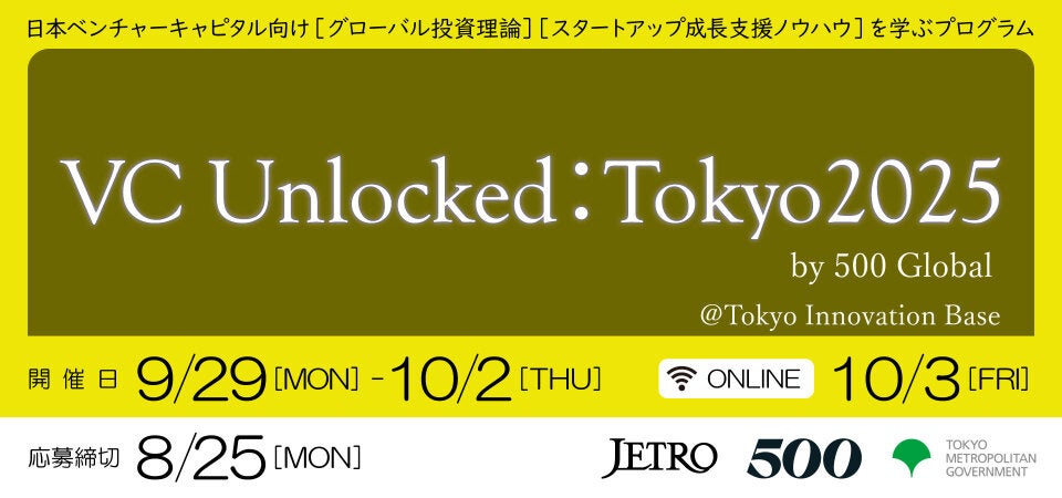 ジェトロは、東京都と連携して、米シリコンバレー発の世界的ベンチャーキャピタルファーム500 Globalの知見とネットワークを活用し、日本のベンチャーキャピタリスト向けプログラム「VC Unlocked: Tokyo 2025」を2025年9月29日(月)より開催します。本日より参加者の募集を開始し、グローバル水準の知識とネットワークを得られる機会を提供します。