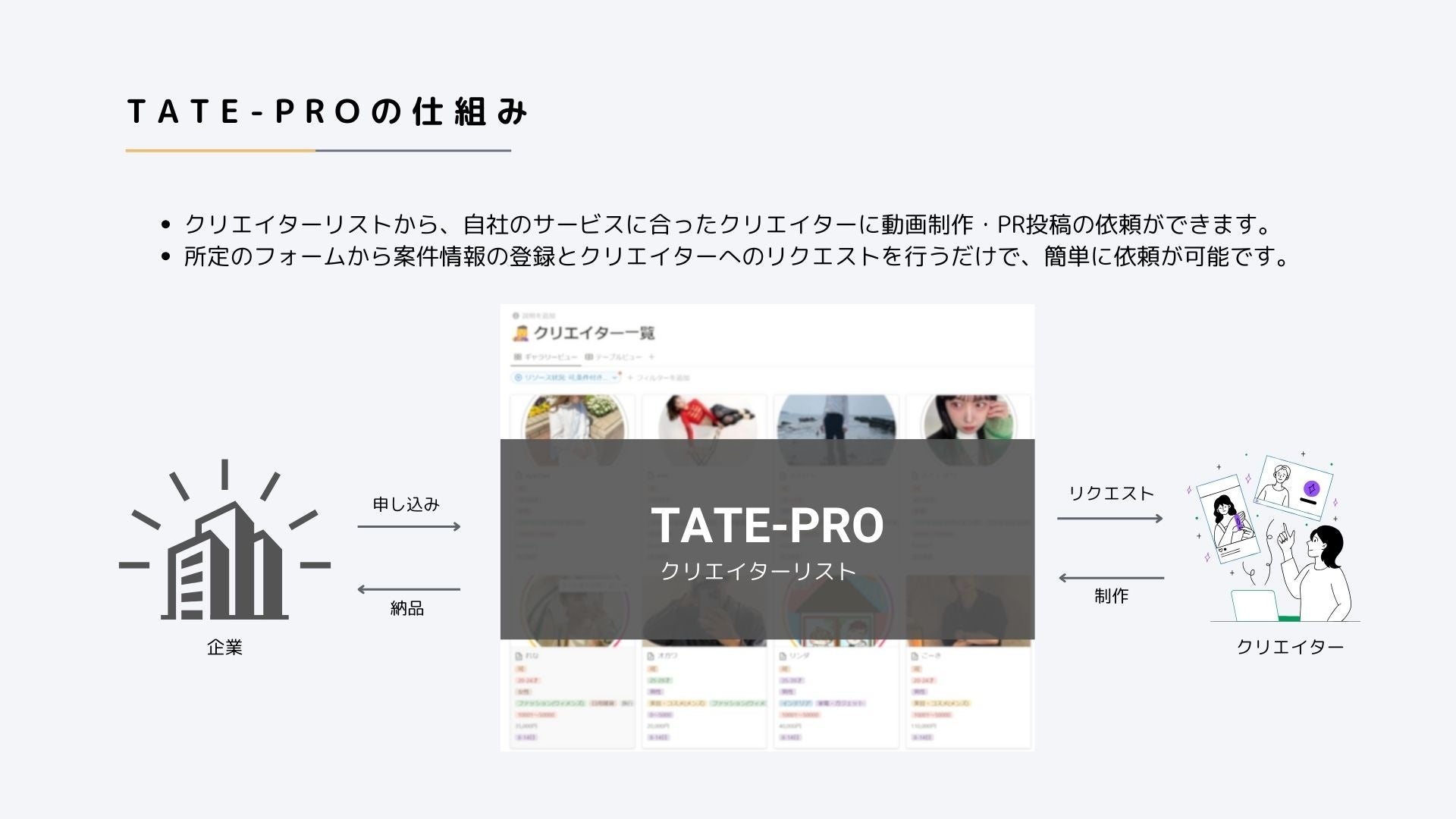 TATE-PROは、縦型ショート動画に精通したクリエイター・インフルエンサーに「手軽に・安価に」PR投稿や動画制作を依頼できるサービスです。