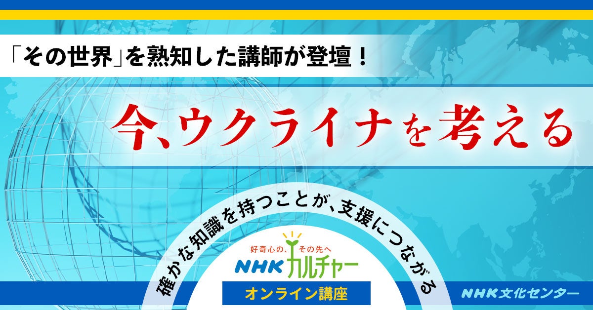 NHK文化センターでは、緊迫するウクライナ情勢を受けて、多様な角度から世界の今を考えるオンライン講座を開催します。最新の情勢や歴史、文化、芸術、語学。ご興味、ご都合に合わせて、お好きな講座を全国どこからでもご受講いただけます。