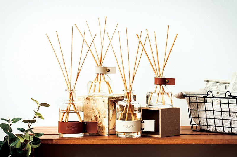 ガラスボトルに、温かみのあるレザー調ベルトを巻き付けアクセントにした、スマートでシンプルなコレクションが登場。コンパクトサイズのため、部屋の様々な場所で香りを楽しめる点も魅力。