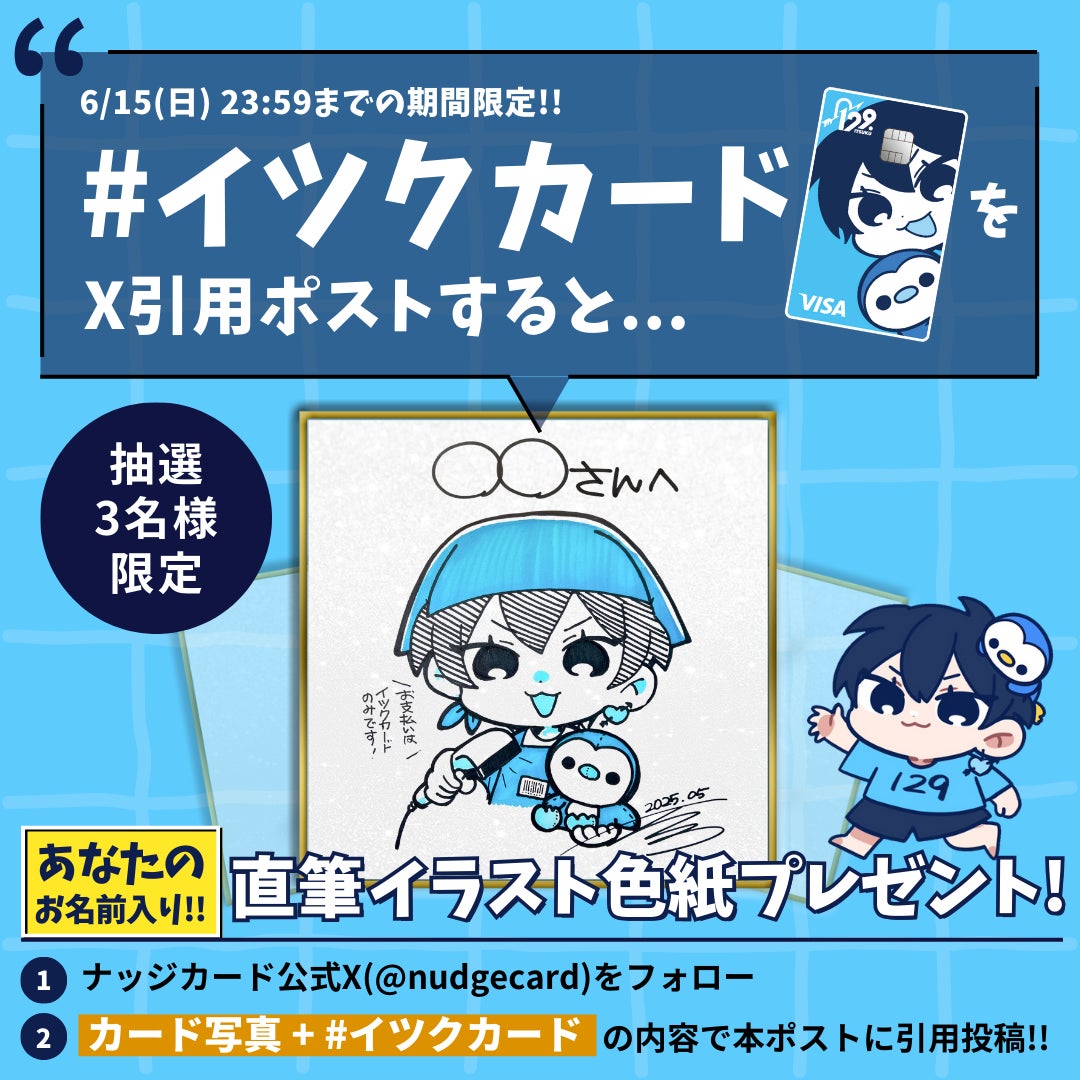 ナッジ公式Xアカウント(@nudgecard)のキャンペーンポストを引用&カード券面写真と一緒に#イツクカードと投稿するとお名前&サイン付きイツク直筆イラスト色紙が3名様に当たる